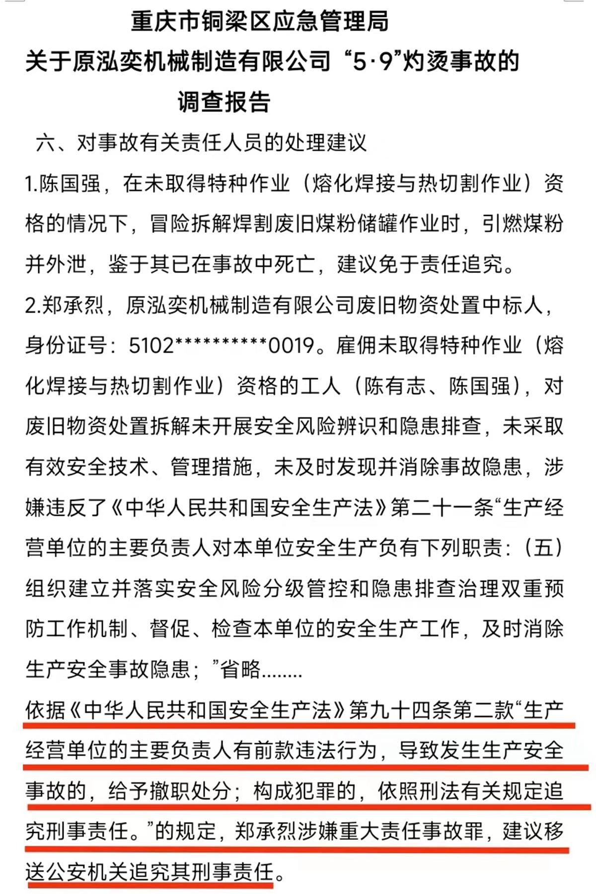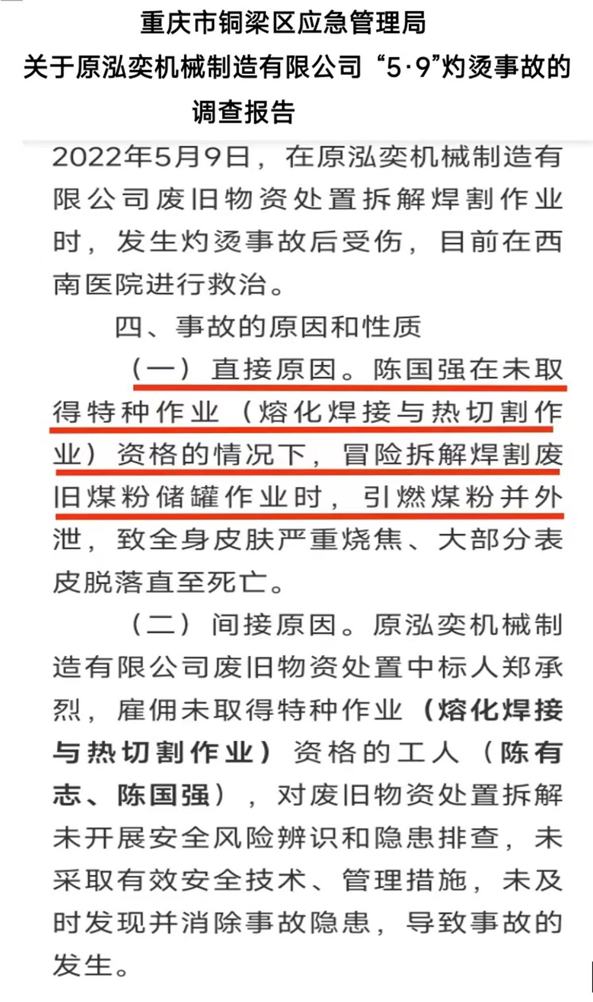 2022年5月9日,重庆铜梁区发生一起煤粉罐燃爆造成一死一重伤的重大事故,当地应急部门调查后上报区政府认定事故是以中标业主郑承烈“雇佣未取得特种作业(熔化焊接与热切割作业)资格的工人陈有志和陈国强违规冒险拆解焊割废旧煤粉储罐作业时,引燃煤粉并外泄发生燃爆事故”,并认定郑承烈承担安全责任事故全部责任,同时移交公安机关,追究其刑事责任。而被认为承担事故责任的业主郑承烈投诉认为,应急部门在事故调查过程中存在多处程序违法,并且伪造证据,将本应由当地福果镇政府承担安全监管不履职的责任,强加于他身上造成他倾家荡产,已经赔偿了上百万的民事赔偿款,还要面临承担重大责任事故罪的刑事责任风险。
