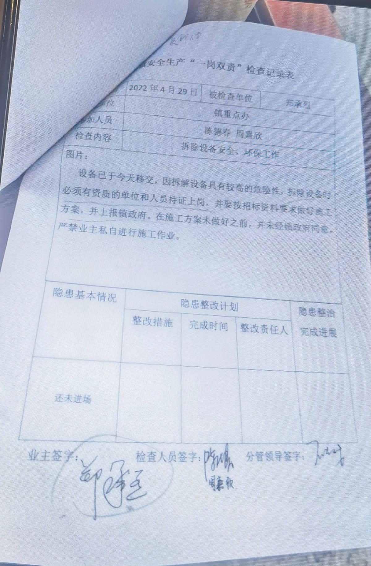 ▲业主认为镇政府伪造他确认签字送交应急局安全检查记录表的证据照片