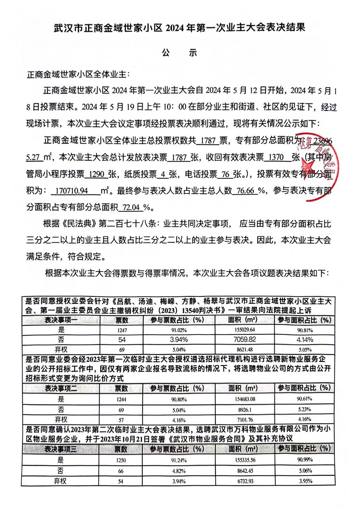 据正商金域世家小区业主委员会公示内容显示,正商金域世家小区2024年第一次业主大会自2024年5月12日开始,2024年5月18日投票结束。本次业主大会的四个议题表决结果为同意。表决结果公示期为:2024年5月19日至2024年5月25日。