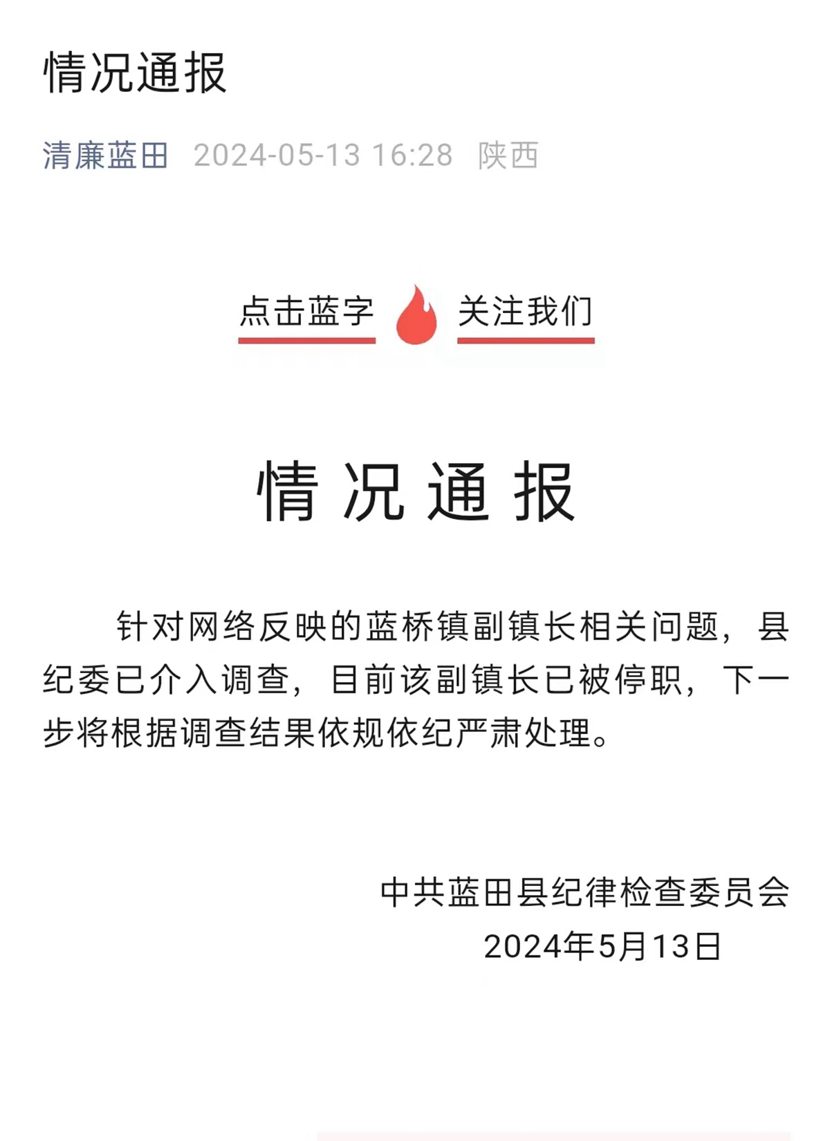 5月13日下午16点28分,中共蓝田县纪律检查委员会发布情况通报。通报称:针对网络反映的蓝桥镇副镇长相关问题,县纪委已介入调查,目前该副镇长已被停职,下一步将根据调查结果依规依纪严肃处理。