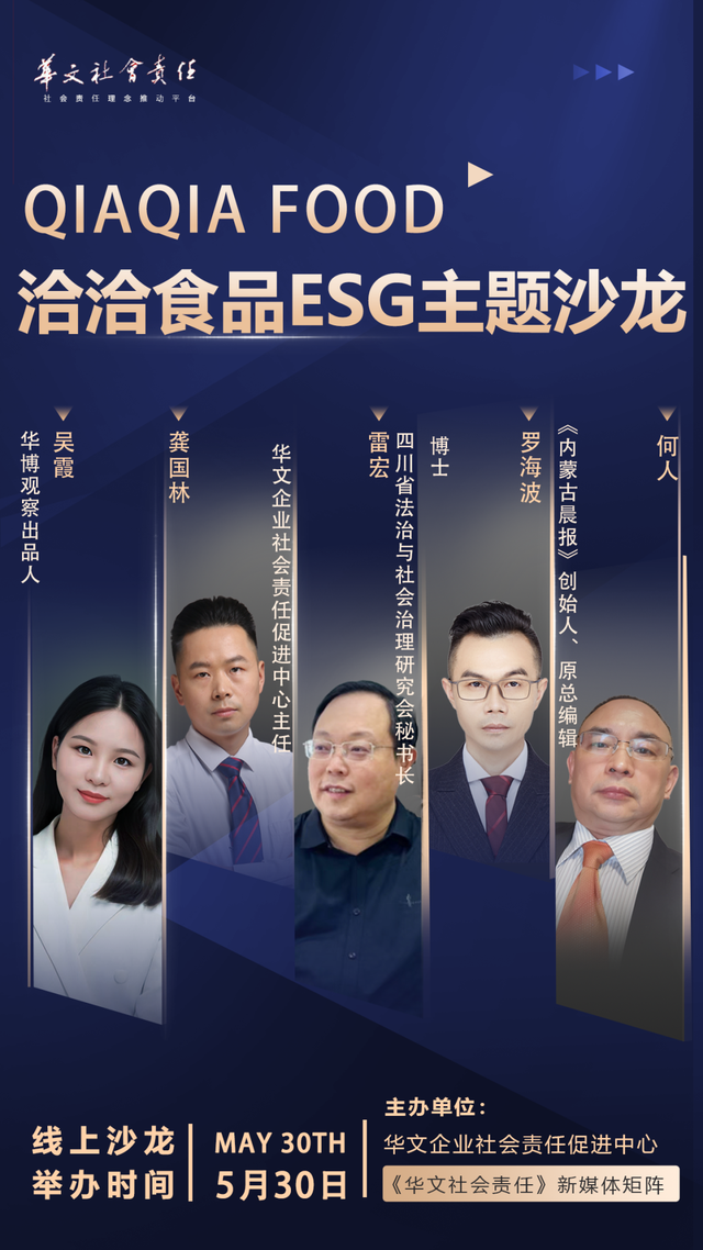 5月30日,华文企业社会责任促进中心主办了新一期“企业ESG建设典型案例”线上沙龙,围绕“洽洽食品”这一典型案例,对食品业ESG建设现状进行探讨与展望。