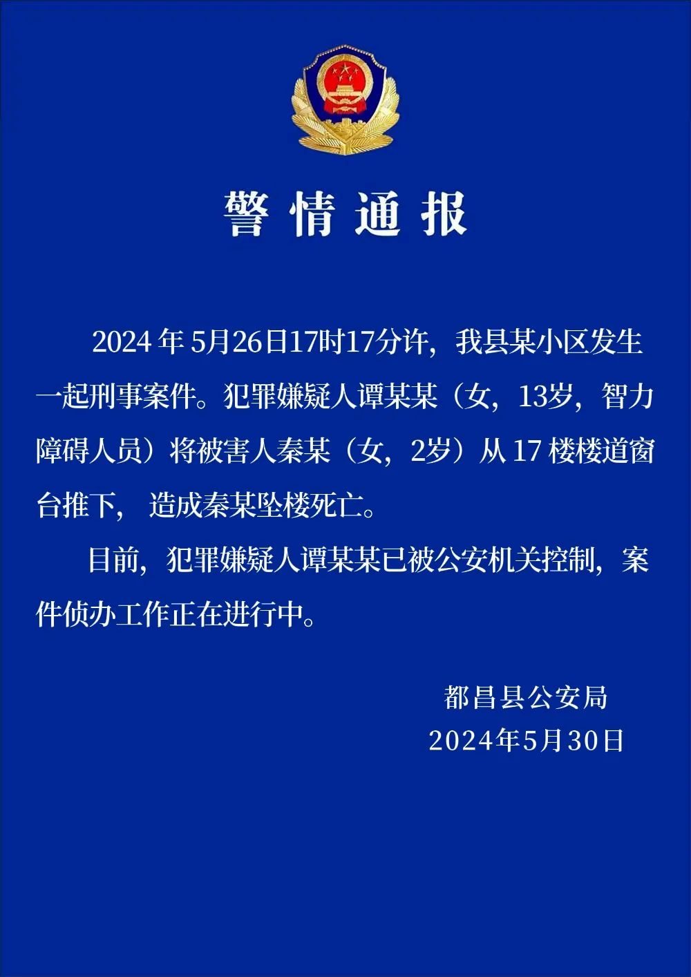 5月30日下午,江西都昌县公安局通报,5月26月17时17分许,都昌县某小区发生一起刑事案件。犯罪嫌疑人谭某某(女,13岁,智力障碍人员)将被害人秦某(女,2岁)从17楼楼道窗台推下,造成秦某坠楼死亡。目前,犯罪嫌疑人谭某某已被公安机关控制,案件侦办工作正在进行中。
