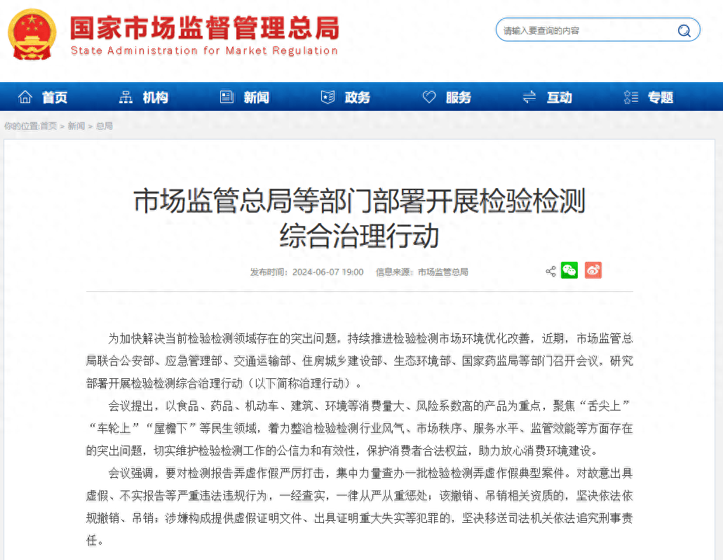 为加快解决当前检验检测领域存在的突出问题,持续推进检验检测市场环境优化改善,近期,市场监管总局联合公安部、应急管理部、交通运输部、住房城乡建设部、生态环境部、国家药监局等部门召开会议,研究部署开展检验检测综合治理行动(以下简称治理行动)。
