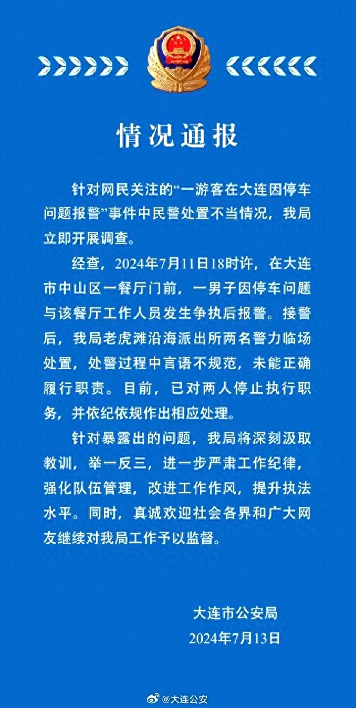 7月13日,大连市公安局发布情况通报。通报称:经查,2024年7月11日18时许,在大连市中山区一餐厅门前,一男子因停车问题与该餐厅工作人员发生争执后报警。